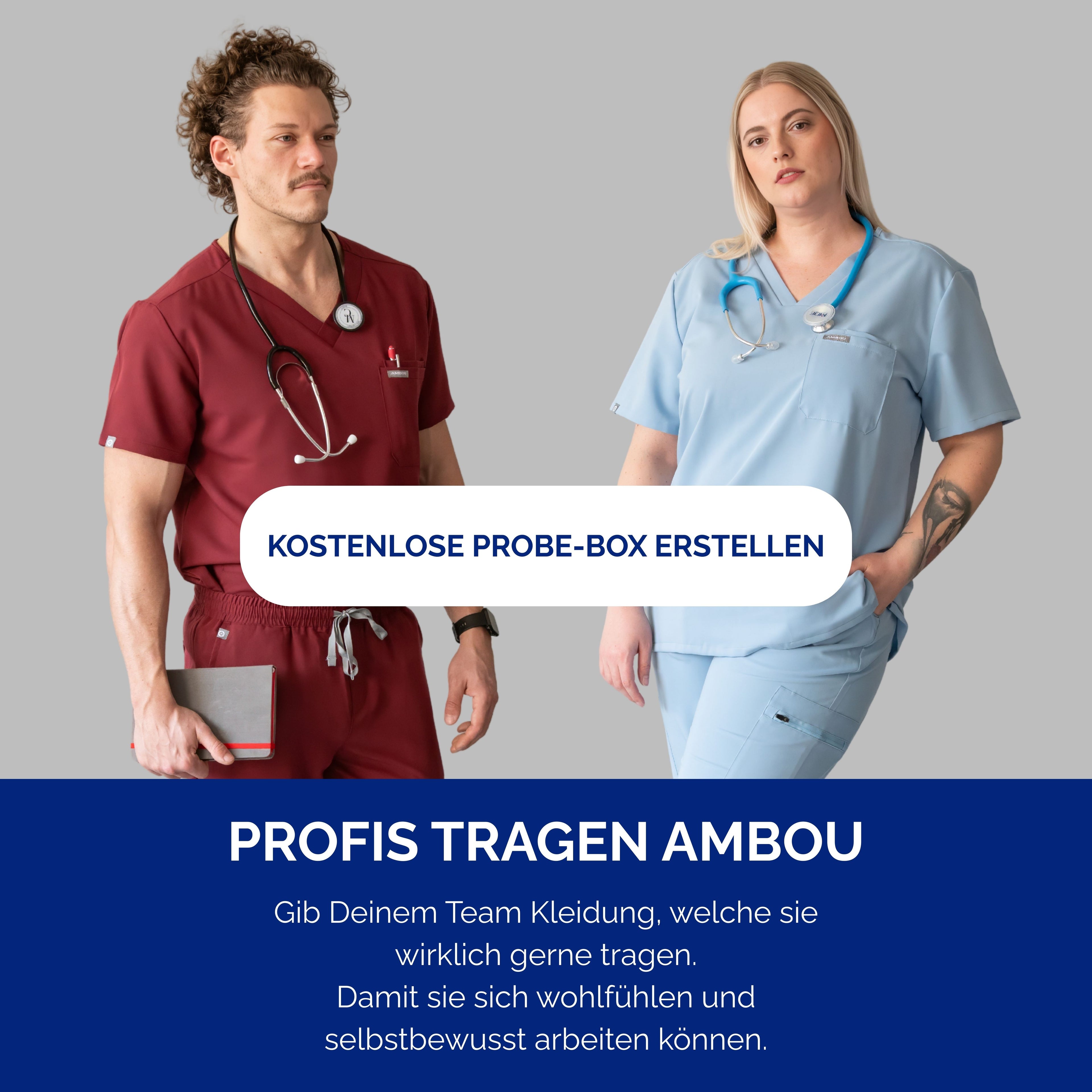Nun gibt es die Ambou Probe-Box. Damit auch komplette Teams in den Genuss von moderner, professioneller Arbeitskleidung kommen.